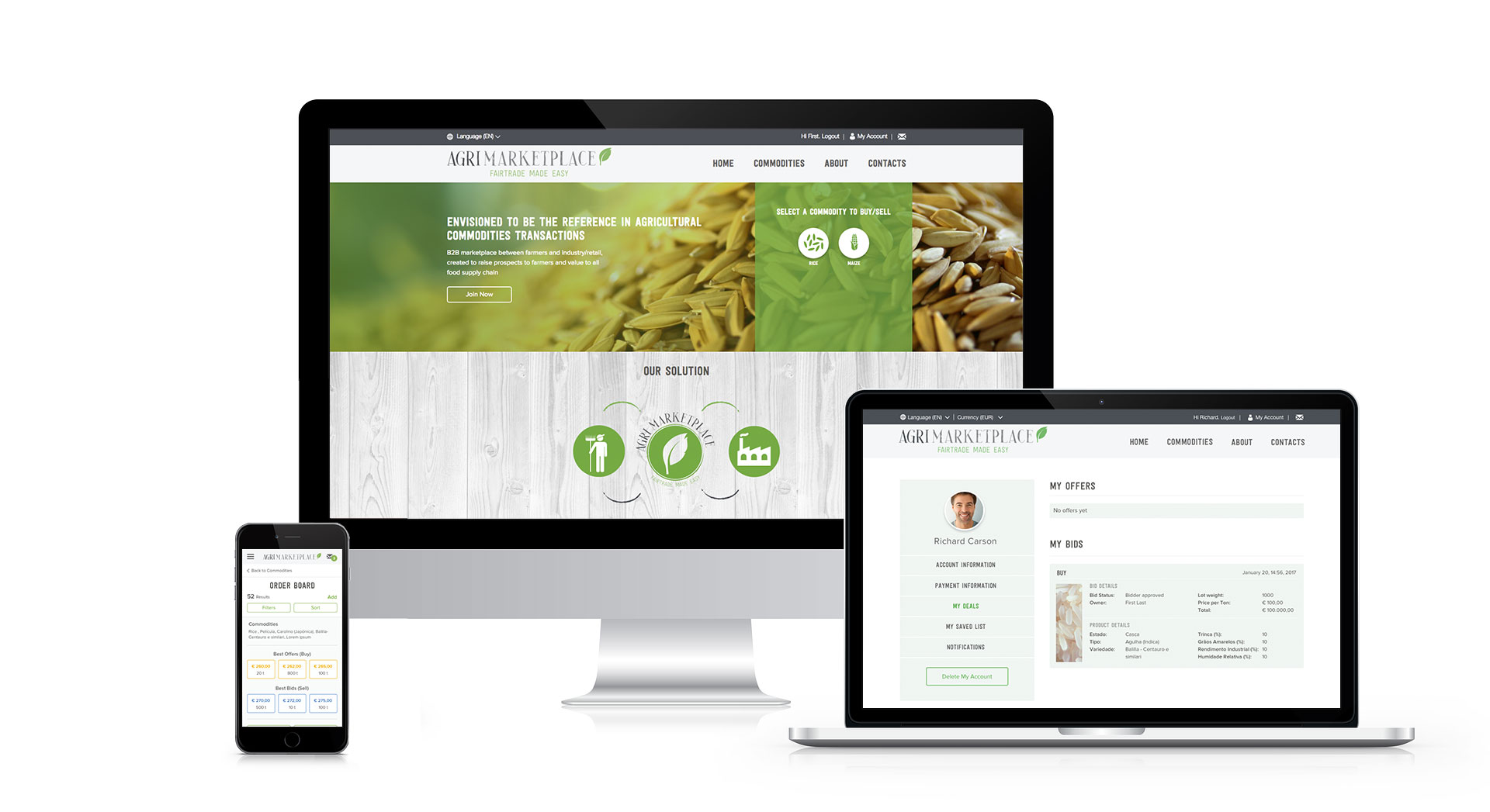 Envisioned to be the reference in agricultural commodities transactions. Agri Marketplace is a B2B global Marketplace, based on core values of fairtrade and transparency, where farmers and industry/retailers make business transactions, supported by premium partners that facilitate logistics and quality insurance of the products.